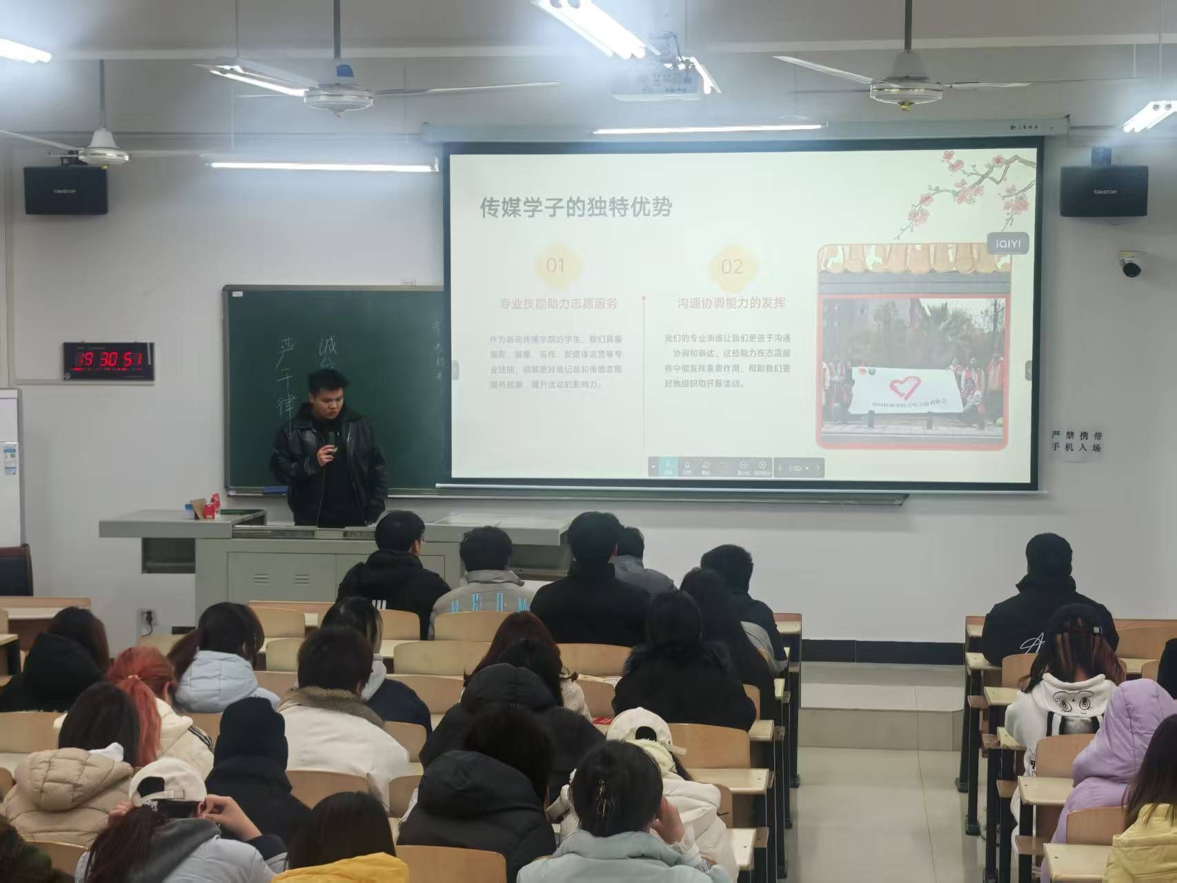 12月14日晚,新闻传播学院2024级的同学们在3310教室共同聆听了一场意义非凡的百生讲坛。学院青年志愿者协会主席夏光榮以“志愿青春:传媒学子的公益力量”为主题,分享了学院青年志愿者协会的初心使命与成长故事,让在场的同学们深切感受到志愿服务的温度与力量。