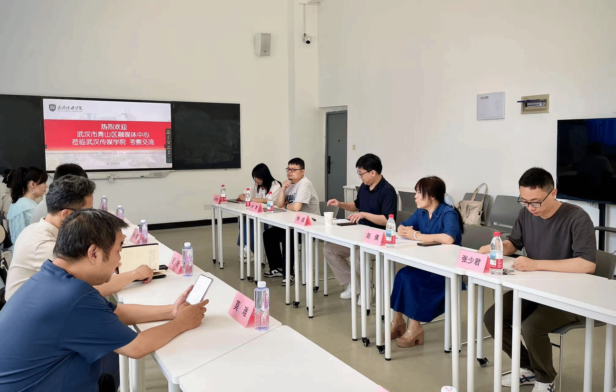 为深化校地合作、推动基层宣传工作创新发展,5 月 21 日,武汉市青山区融媒体中心主任纪珩率副主任莫难、网宣科负责人毕可、舆情科科长章岚,以及“美丽青山”微信公众号及视频号运营编辑杜雅康、刘佳一行,莅临我院开展合作交流座谈会。新闻传播学院院长赵倩、副院长张少君、网络与新媒体系主任徐超、广告系主任杜溪、广播电视学系主任卢愿、传播系主任宋博雅等相关负责人出席会议,双方围绕社区宣传新模式构建、校地协同育人机制等议题展开深入研讨。